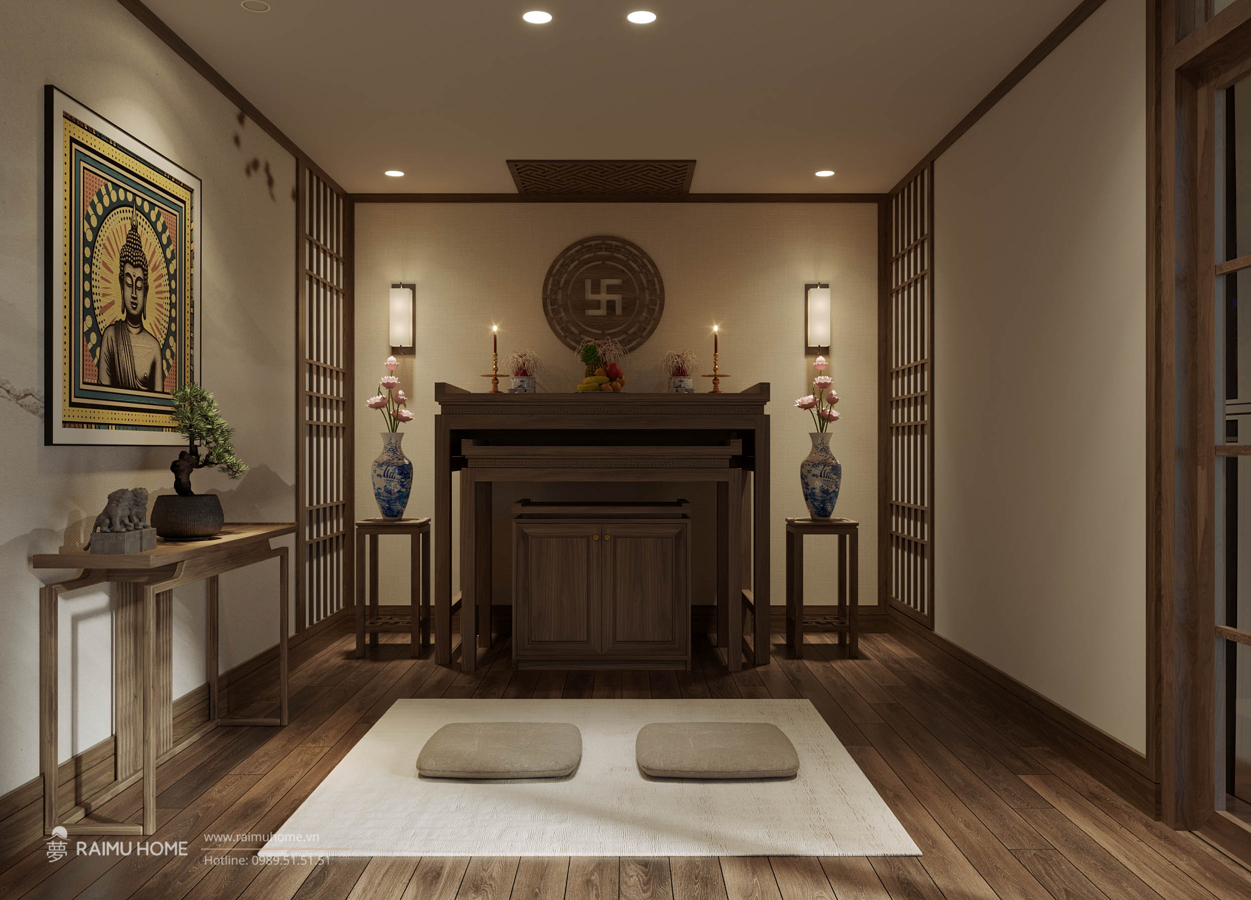 Không gian phòng thờ trang nghiêm, tĩnh lặng.